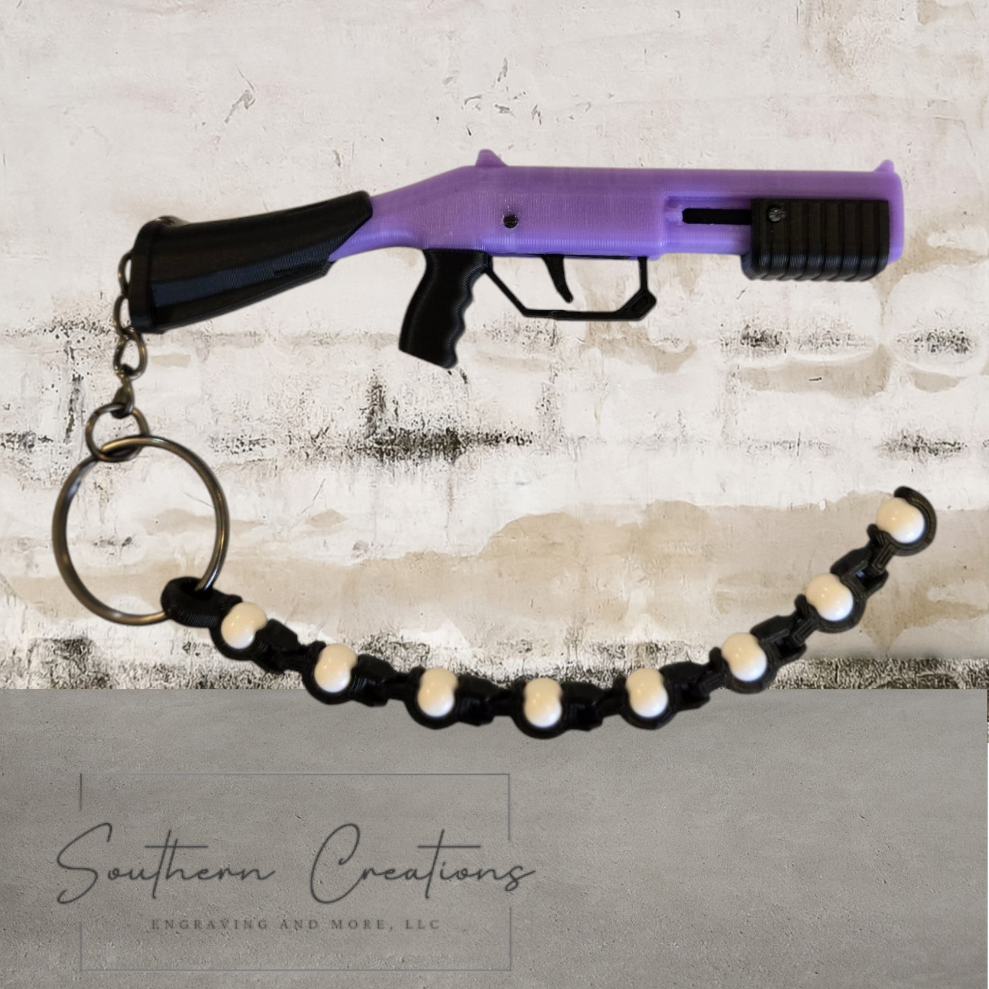 The Pump Action Shotgun Keychain is a functional BB blaster designed for ages 14 and up. Made of durable plastic in a vibrant purple color, this 3d printed keychain is both practical and stylish. With a unique pump action mechanism and working trigger, it provides a fun and entertaining way to blast small balls, making it a great collectible item for enthusiasts and hobbyists. Included with the blaster is an eight BB ammo belt.