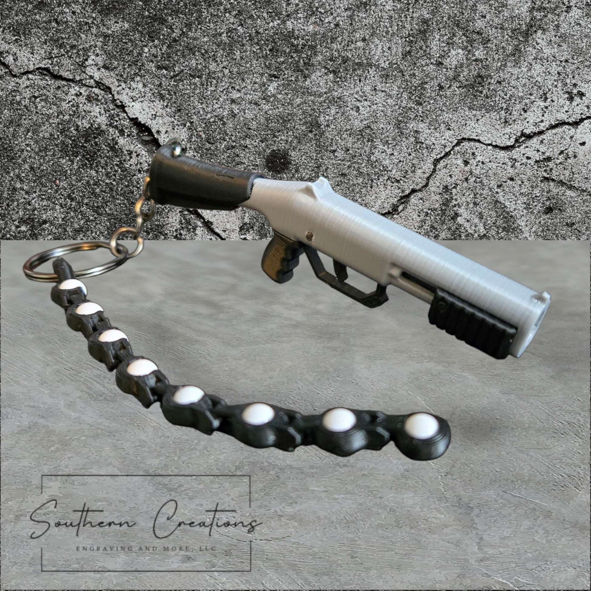The Pump Action Shotgun Keychain is a functional BB blaster designed for ages 14 and up. Made of durable plastic in a vibrant purple color, this 3d printed keychain is both practical and stylish. With a unique pump action mechanism and working trigger, it provides a fun and entertaining way to blast small balls, making it a great collectible item for enthusiasts and hobbyists. Included with the blaster is an eight BB ammo belt.